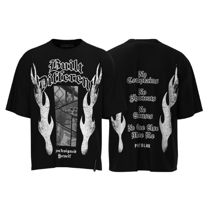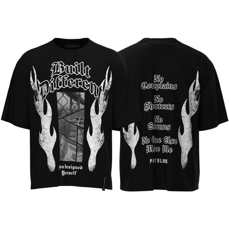 Show the world what you're made of with the Built Different T-Shirt. Crafted from 100% cotton for a comfortable, breathable feel, this tee is built for statement-makers. The front features bold "Built Different" puff print lettering with rhinestone accents and a striking photo graphic, while the back carries a powerful message: "No Complains, No Shortcuts, No Excuses, No One Else Made Me." The mix of silkscreen/DTG printing, puff print, and rhinestone detailing gives this piece a premium, textured finish.